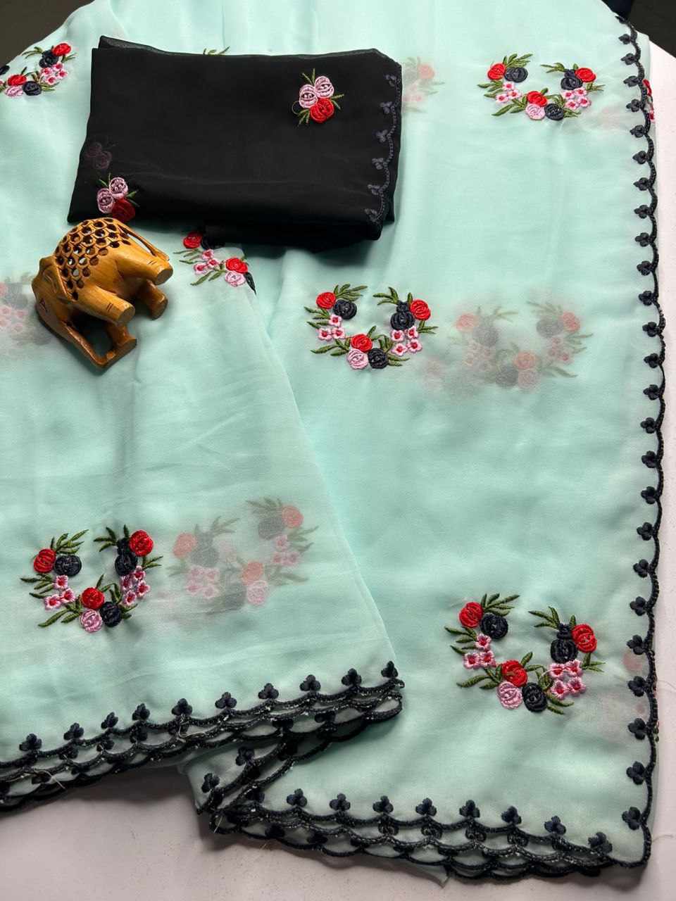 Fabric - soft georgette with beautiful floral design embroidery work with scalloped cutwork border