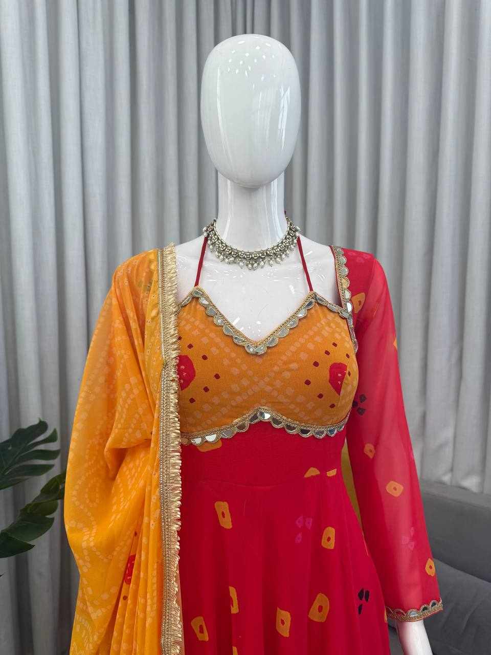 The heavy flair, mirror detailing, and elegant digital print create a graceful and eye-catching look.